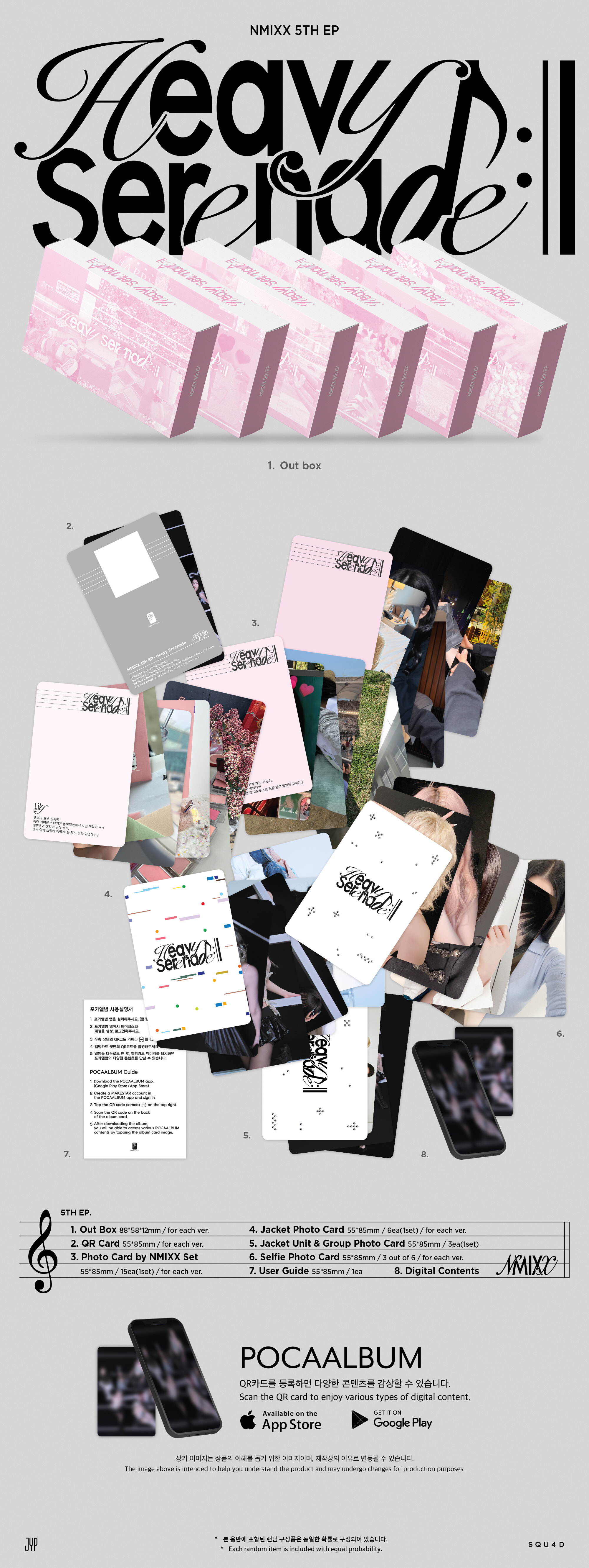 * Out Box + QR Card + Photocard by NIXX (15 P) + Jacket Photocard (6 P) + Jacket Unit & Group Photocard (3 P) + Random Selfie Photocard + User Guide